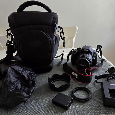 Nikon digital systemkamera med flera objektiv och tillbehör. Utrustningen på bilden inkluderar kamerahus, olika utbytbara objektiv, kameraväska, laddare, kablar, stativ och övriga småtillbehör. Passar för allmän fotografering, resor och vardagsbruk där man vill kunna byta objektiv och anpassa kameran efter motiv och situation.
