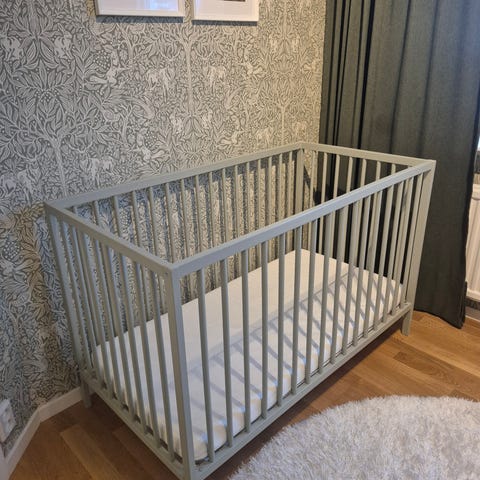 Vi säljer nu en IKEA ”Sniglar” spjälsäng i bok. Sängen är monterad men aldrig använd!