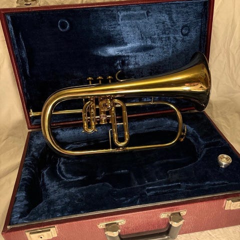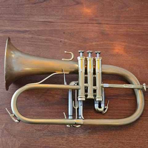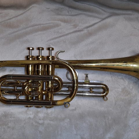 Säljer ett Royal Tone bariton/euphonium, ett klassiskt blåsinstrument i mässing, tillverkat av Blechblas-Markneukirchen (Tyskland) , ett område känt för traditionellt och gediget blåsinstrumenthantverk.