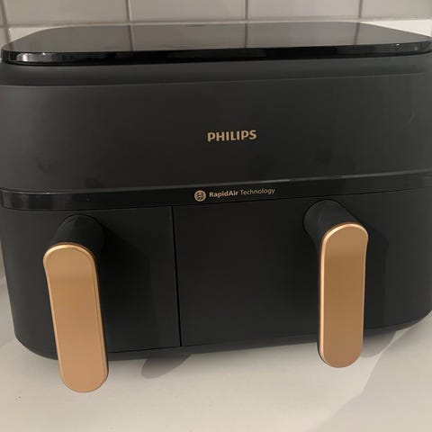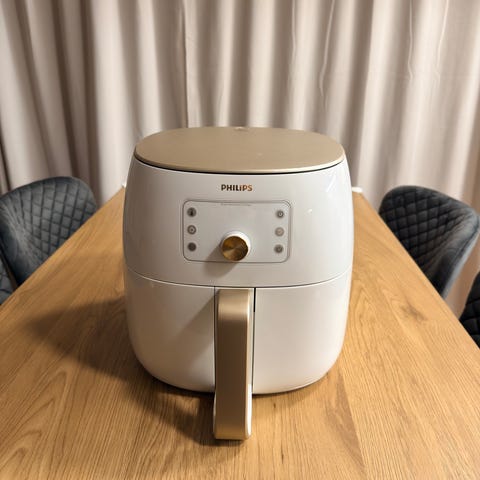 Philips airfryer i svart utförande. Modellen har utdragbar korg med handtag och frontpanel med vred för inställning av tid och temperatur. Passar för fritering och tillagning av mat med hjälp av varmluft i kök och hushåll.