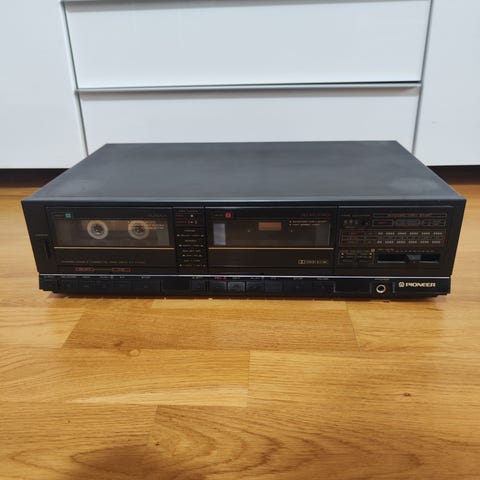 kassettbandspelare i silverfärg. Enheten har frontmatad kassettlucka, analoga nivåmätare, bandräknare och funktionsknappar på framsidan. Avsedd för uppspelning och inspelning av kassettband som del av ett stereo- eller hifisystem. Ansluts till förstärkare eller receiver via ljudutgångar på baksidan.