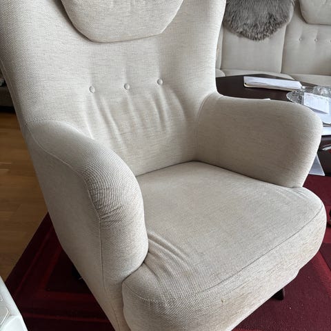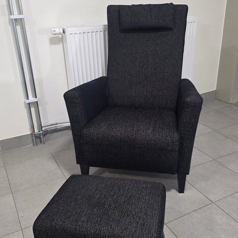 Mio fåtölj i grått tyg. Fåtöljen har hög rygg med lätt markerat nackstöd och knappar i ryggen. Breda armstöd och stoppad sits ger en ombonad sittkänsla. Passar till vardagsrum, läshörna eller sovrum som extra sittplats. Med en pall