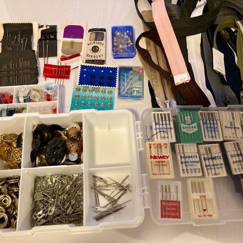 Pysselkit, garn, stickor, virknålar, böcker (på tyska), blandade färger
