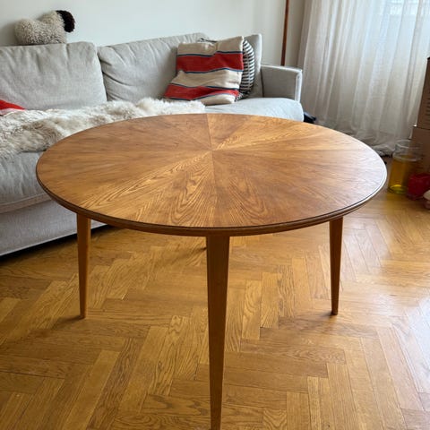 Har en del märken på bordskivan, i övrigt stabilt och i gott skick. Benen är enkla att skruva bort för transport