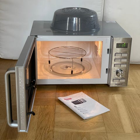 Menuett mikrovågsugn i vit färg. Fristående modell med mekaniska vred på fronten för inställning av effektläge och tid. Utrustad med roterande glastallrik invändigt. Passar för uppvärmning och enklare tillagning av mat i kök, studentboende eller kontor.