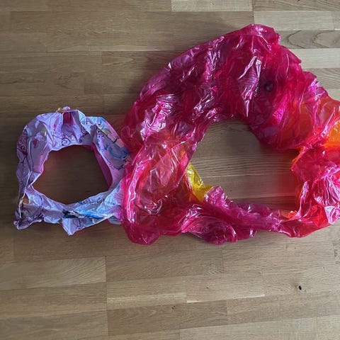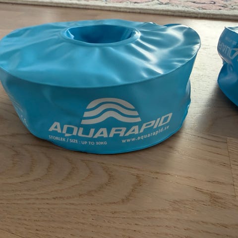 Gröna uppblåsbara simringar för barn. Passar som flythjälp vid bad och vattenlek. Tillverkade i plastmaterial med rund öppning i mitten för att träs på armarna. Lämpliga att använda i pool eller vid strand under uppsikt av vuxen.