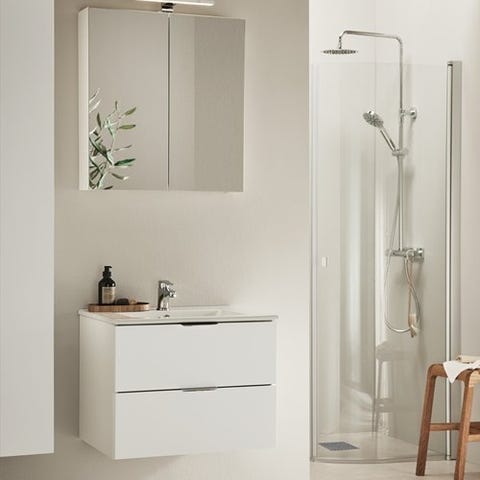 Badrumsskåpet är färdigmonterat och enkelt att installera med väggskena och justerbara upphängningsbeslag samt utrymme förberett för både vägg- och golvavlopp.