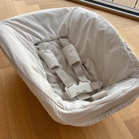 Stokke barnstol i grön färg. Stolen är utformad för små barn och har en form som ger stöd runt kroppen. Sittdelen är nedsänkt med upphöjt stöd framtill. I stolen finns remmar som kan användas för att spänna fast barnet. Passar för inomhusbruk på golv eller annan stabil yta enligt tillverkarens anvisningar.