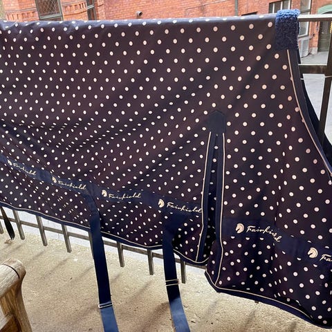 Ylleländtäcke i färgen brunt med guldpasspoal i storlek ponny.