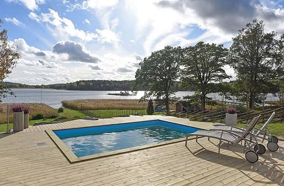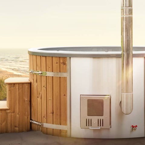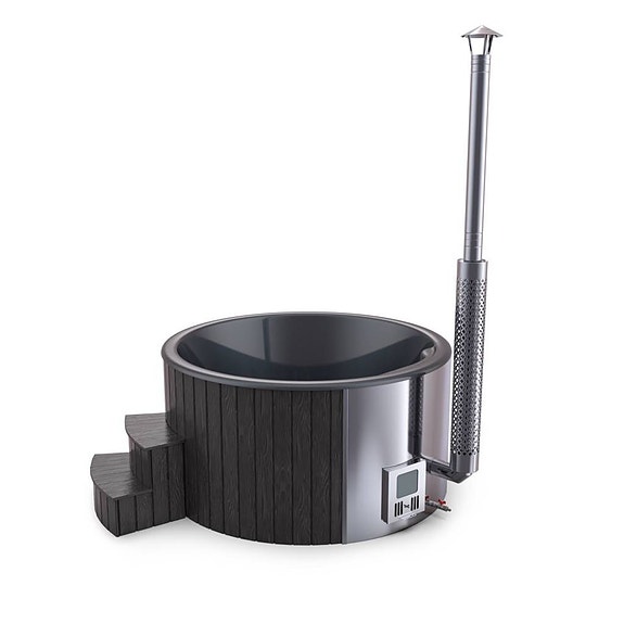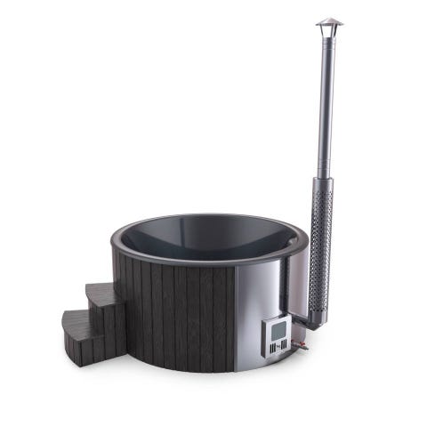 En exklusiv isolerad badtunna med en integrerad kamin med glaslucka som eldas från utsidan. Rymlig badtunna på 225cm i diameter.