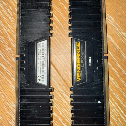 Corsair Vengeance LPX DDR4 RAM-minne i svart utförande. Minnesmodulerna är utrustade med kylflänsar för bättre värmeavledning och är avsedda för stationära datorer med DDR4-stöd. Passar som uppgradering eller ersättning av befintligt arbetsminne i kompatibla system.