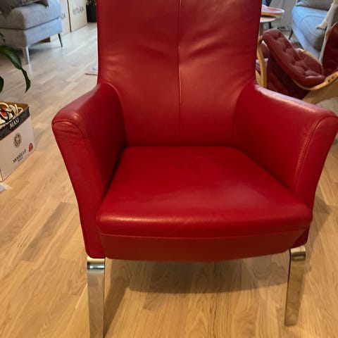 Fåtöljen är stabil och bekväm med en tidlös design. Lädret har naturlig patina och mindre bruksspår som ger charm och karaktär.