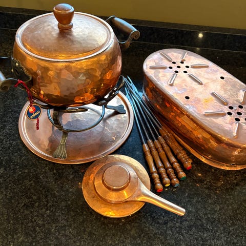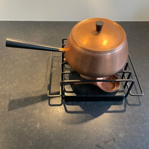 Säljer en fonduepanna i koppar med ben av järn. Ok skick. Brännare och gafflar saknas, men i övrigt fullt användbar.