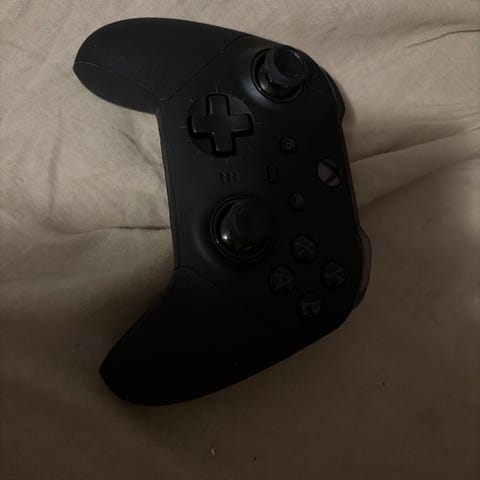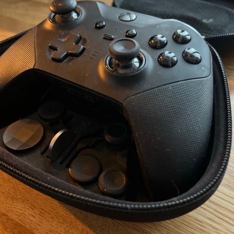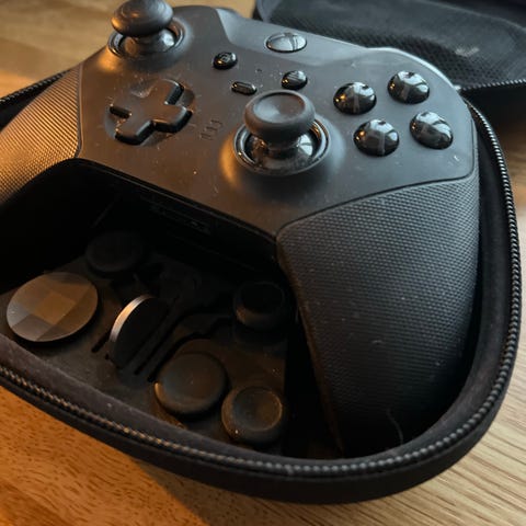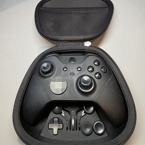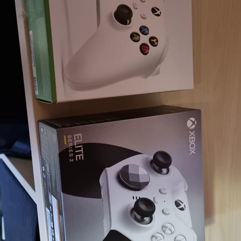 Xbox Elite trådlös handkontroll i vit färg. Kontrollen levereras i ett fodral tillsammans med utbytbara styrspakar, styrkors, paddlar och flätad kabel. Avsedd för spel på Xbox-konsol och kompatibla enheter som stöder Xbox-handkontroller. Justerbara delar gör det möjligt att anpassa grepp och knappar efter önskemål. Drivs av utbytbara batterier eller via kabelanslutning beroende på inställning och tillbehör.