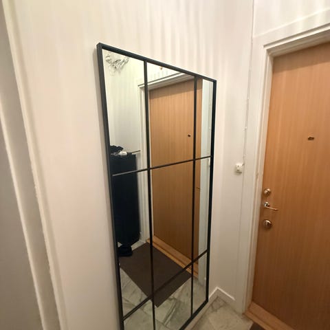 IKEA spegel med bred svart ram. Helkroppsspegel som kan lutas mot vägg eller monteras enligt tillverkarens anvisningar. Passar i sovrum, hall eller dressingroom för helfigursspegling och som inredningsdetalj. Ramen är i svart utförande som ger en tydlig inramning runt spegelglaset.