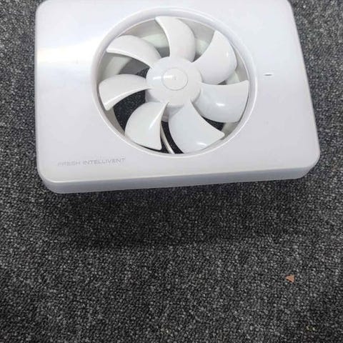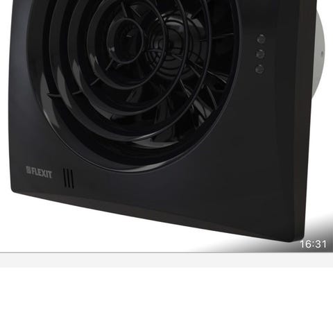 Badrumsfläkt modell Pax Calima, deras toppmodell med appstyrning, fuktsensor, ljussensor, värmeförflyttare m.m.