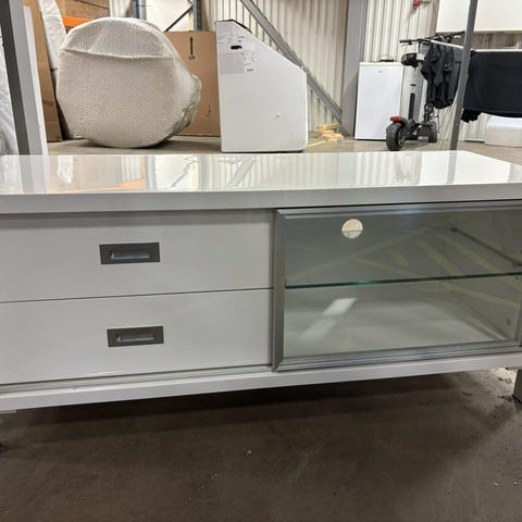 Stilren vit TV-bänk med skjutdörr i frostat glas, glashyllor och två lådor – praktisk och modern förvaring för TV och media.