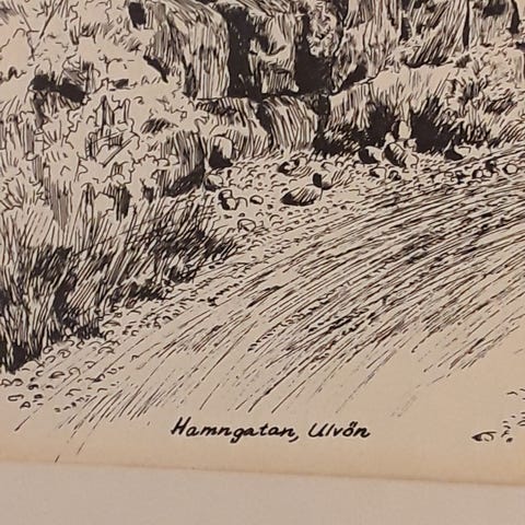 En glaserad gammal skiss som visar det gamla handelscentret i Piteå. Konstnärens signatur är svår att identifiera och datumet saknas. Om jag minns rätt berättade den tidigare ägaren, som nu är borta, att det är ett sällsynt verk av en känd konstnär från Stockholm som arbetade på Piteå tidning på 60-talet.Mått: höjd 37 cm. Bredd ca 49 cm. Vikt ca 1200 g.