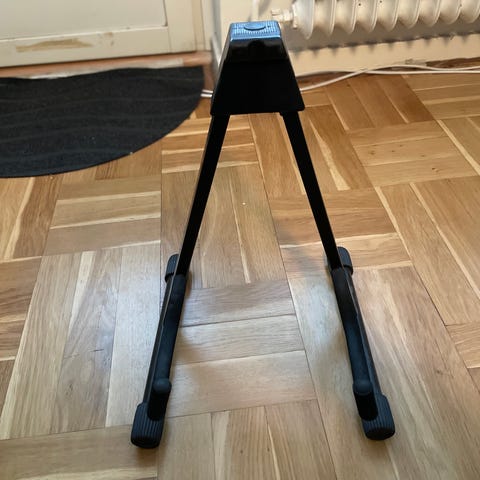 Gitarrställ i svart färg. Vikbart A-stativ som placeras på golvet för att hålla en gitarr upprätt när den inte används. Passar akustiska eller elektriska gitarrer beroende på kroppsstorlek och form. Gummifötter och vadderade kontaktytor för att skydda golv och instrument.