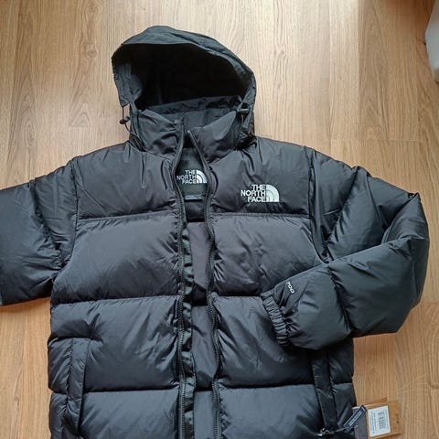 The North Face vinterjacka i dun för herr, storlek L. Jackan är blå och har huva samt quiltad konstruktion med dunfyllning. Passar för kallare väder och vinterbruk.