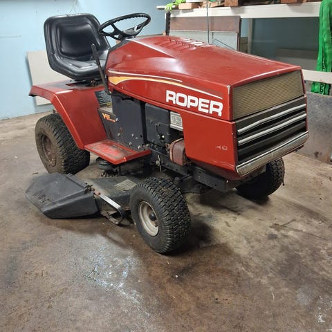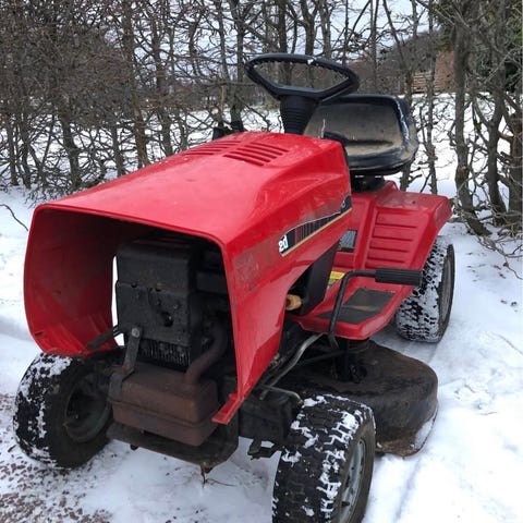 Rally 12 HP åkgräsklippare i röd färg. Modellen är utrustad med förarsäte och rattstyrning samt klippaggregat monterat under maskinen. Avsedd för klippning av gräsmattor och större ytor där åkgräsklippare är lämplig. Drivs av en bensinmotor på 12 hästkrafter. Maskinen har luftgummihjul fram och bak för körning på gräsytor. Ena däcket fastnar ibland och nytt batteri behövs utöver de funkar den fint