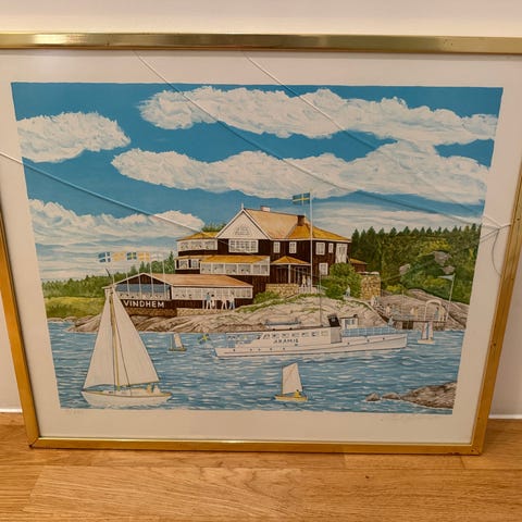Litografi, nr 37/260, M Söderlundh, inramad av glasmästare, bredd 59 cm, längd 66 cm.