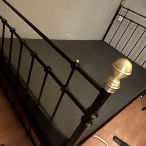 IKEA sänggavel i metall med svart lackerad yta och dekorativa mässingsfärgade knoppar upptill på hörnstolparna. Gaveln har ett klassiskt, rutmönstrat spjälutförande. Passar som huvud- eller fotgavel till säng, och monteras mot sängstomme eller vägg beroende på behov. Lämplig för sovrum där man önskar en enkel metallgavel med traditionellt uttryck.Sängen har huvud och fotända och givetvis alla delar för att bygga sängramen.