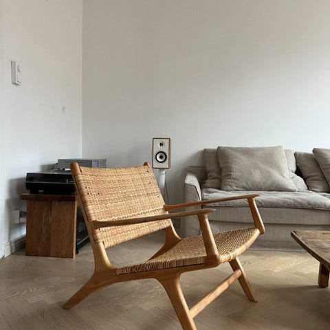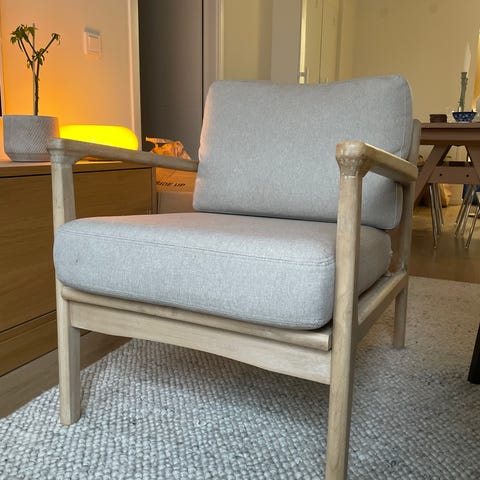 Fåtölj med stomme i mörkbetsat trä och sidor/rygg i rotting. Sittdynan är klädd i ett ljust tyg. Öppen och låg modell som passar som sittmöbel i vardagsrum, sovrum eller läshörna. Rottingpanelerna ger genomsläppligt uttryck och trästommen står på fyra raka ben. Sitsen är bred vilket ger gott om utrymme för en person att sitta bekvämt.