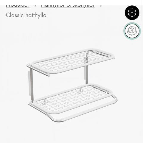 Ikea hatthylla med klädkrokar i vit färg. Övre hylla för förvaring av till exempel hattar, mössor eller korgar. Under hyllplanet finns en stång för galgar samt en rad med flera knoppar för upphängning av kläder, väskor eller accessoarer. Väggmonterad modell med konsoler i mörk färg som ger stabilitet och stöd.