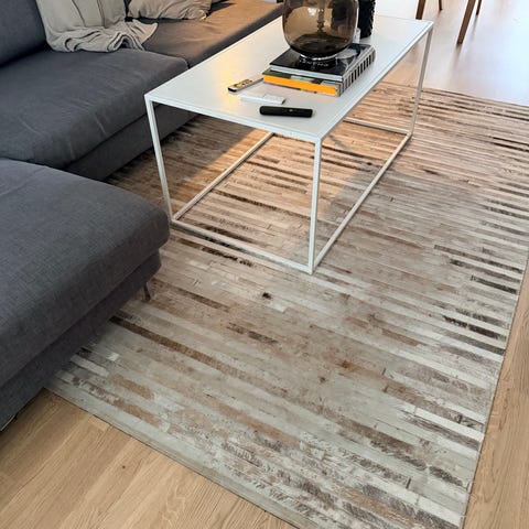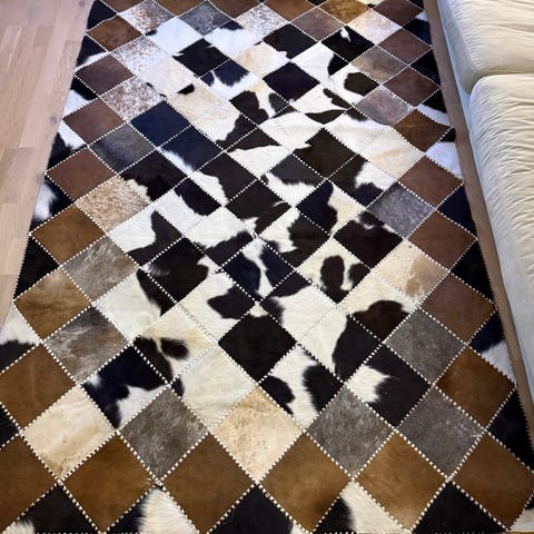 Kohud brunvit matta. Naturfärgad kohud med mörkbruna och vita partier. Passar som golvmatta i vardagsrum, sovrum eller hall. lite slitage på två ställen i huden och en söm har gått upp i ena kanten, lätt fixat.