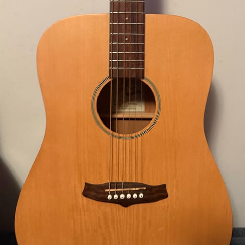Säljer min Tanglewood TW28 CSR-liknande akustiska gitarr och fodral — en gedigen och bra spelbar akustisk dreadnought med solid cedertopp och rosenträ-sidor och bakstycke, vilket ger ett varmt och fylligt akustiskt ljud med bra projection för både nybörjare och mer erfaren spelare