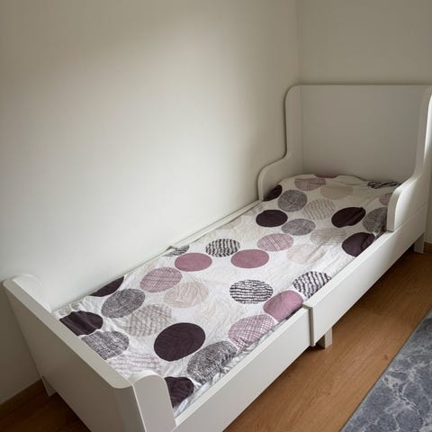 IKEA juniorsäng i vit färg. Sängen går att göra mindre och längre. Madrasser ingår en lång och en att lägga till priset är fast.