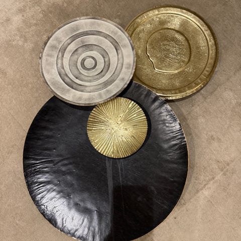 Mio väggdekoration i metall med bladmotiv. Dekorationen består av flera runda bladformade delar i en metallisk ton monterade på tunna metallstänger. Avsedd att hängas på vägg som inredningsdetalj i exempelvis vardagsrum, hall eller sovrum.