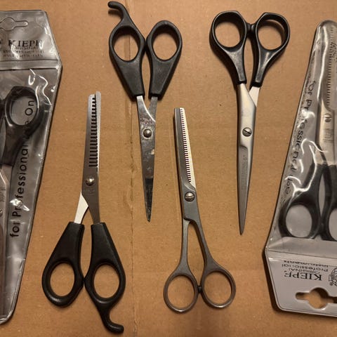 Storleken är liten. Kvinna som brukat dessa i sitt yrke som frisör. Längden är 125 mm. Fingerhål 15-17 mm.