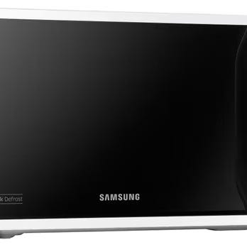 Samsung mikrovågsugn i svart utförande. Fristående modell med digital panel och flera förinställda program enligt knapparna på fronten. Passar för uppvärmning, upptining och enklare tillagning av mat i kök eller pentry. Ytterhölje i metall med svart frontlucka och kontrollpanel på sidan.