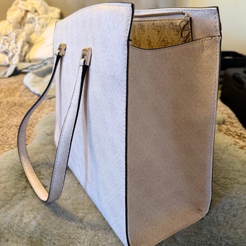 Guess handväska i ljusbeige. Huvudfacket stängs med dragkedja och insidan har flera fack, inklusive öppna fack och mindre fack med dragkedja. Passar för vardagsbruk och rymmer exempelvis plånbok, mobil, nycklar och mindre personliga tillhörigheter.
