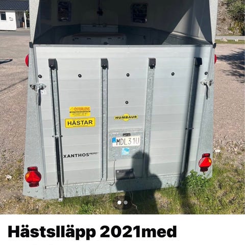 Hundtransport släpvagn i vit och röd färg. Släpet är utrustat med bakdörrar med galler för ventilation samt takluckor. Enaxlat chassi. För transport av hundar eller andra mindre djur, med slutet skåp och ventilationsöppningar för luftcirkulation.