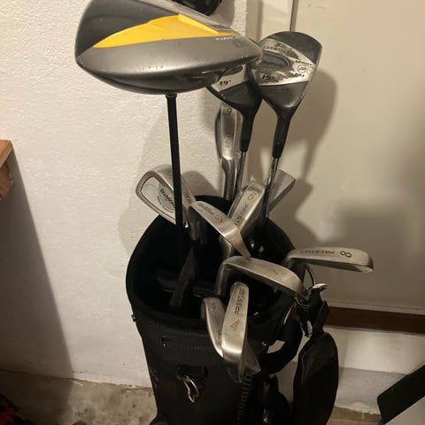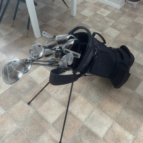 Säljer ett golfset med vagnbag.
