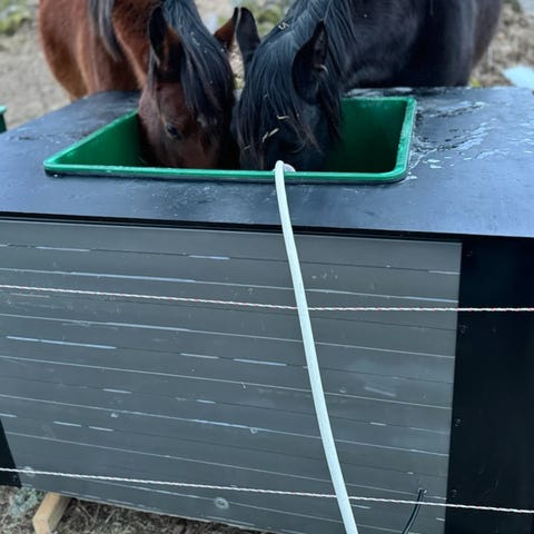 2 höautomater för hästar med styrbox och skyddande hö-lådor