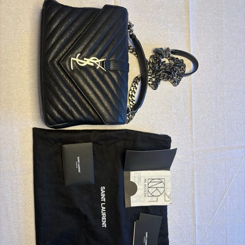 YSL axelremsväska för kvinna i svart läder. Väskan har quiltad design med YSL-logotyp på framsidan och kedjerem som kan bäras på axeln. Modell med lock och magnetstängning. Baksidan har en ytterficka och insidan är utformad för att rymma vardagliga tillhörigheter som plånbok, mobil och nycklar. Passar som vardags- och kvällsväska.