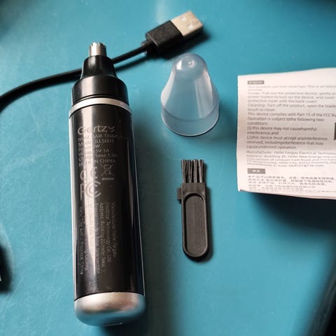 Elektrisk rakapparat med två roterande rakhuvuden. Färg svart. Levereras med USB‑laddkabel, liten rengöringsborste och bruksanvisning. Lämplig för rakning av ansikte och hals. Drivs via inbyggt uppladdningsbart batteri som laddas med medföljande kabel.