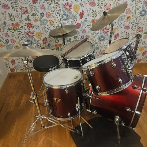 Kuriosa, har tillhört Ludvig Kennberg - Ghosts trummis! Här fick setet giga och lufta sig. Finns en hel del dings och minnen från det, men syns inte mycket framifrån.