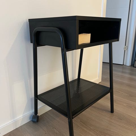 Säljer två svarta sängbord i metall med knopp i mässing. Båda borden är i fint skick och har utdragbar låda samt hyllplan.