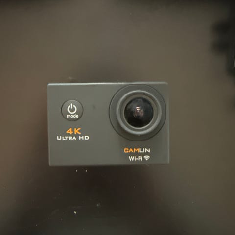 Ricoh WG-M2 actionkamera med 4K-videoinspelning och 204° vidvinkelobjektiv. Kameran har en kompakt, robust konstruktion i gul och svart färg, med inbyggd skärm på baksidan för bild- och videokontroll. På sidorna finns knappar för inspelning, meny och uppspelning, samt indikator för trådlös anslutning. Undersidan har fäste för stativ eller monteringstillbehör. Lämplig för inspelning av aktiviteter och vardagssituationer där ett litet och tåligt kamerahus behövs.