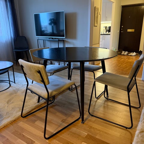 Stolarna är i sammetstyg så därav ser färgen ojämn ut på stolen, men det är inga fläckar!
