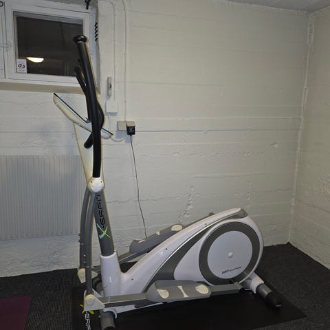 Crosstrainer träningsmaskin för hemmabruk. Utrustad med handtag och fotplattor för konditionsträning och helkroppsträning inomhus. Passar för användning i hemmet för exempelvis promenad- och löpsimulering samt allmän motionsträning.