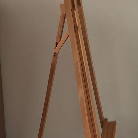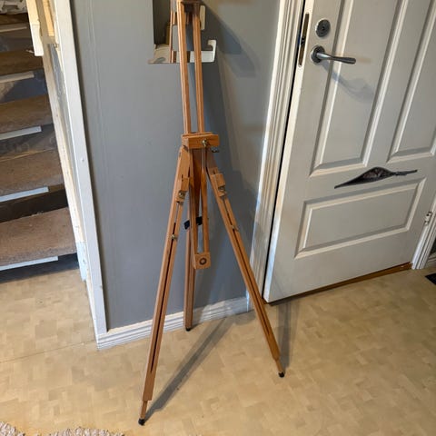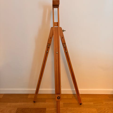 Easel hopfällbart staffli i trä i naturfärg. Staffliet är portabelt och kan fällas ihop för enkel förvaring och transport. Passar för målarduk eller skiva och kan användas för måleri, presentationer eller uppställning av tavlor och bilder i hemmet, ateljén eller på evenemang. Finns att hämta i Särö, alt. kan det tas med in till Göteborg på väg till eller från jobbet då jag passerar stan.