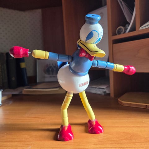 Apa med kläder och basker som slår på trumma. Metall. 1940-tal