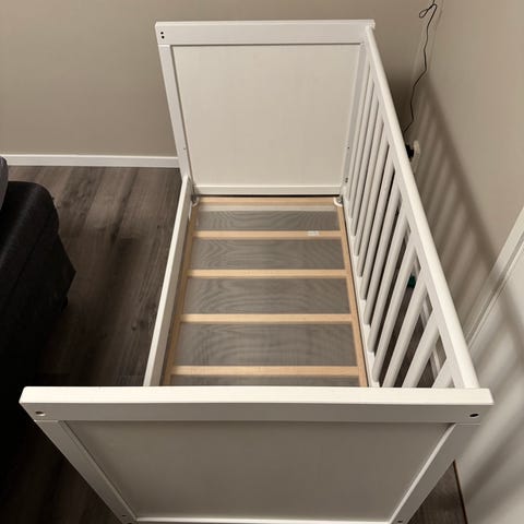 Säljer vår spjälsäng från IKEA inkl madrass. Smidig att montera, sängbotten går att placera i två olika höjdlägen. Bäddmåtten är 60*120cm