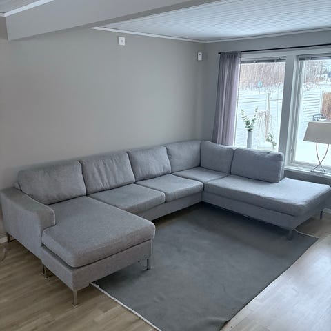 Rymlig och stor soffa i bra skick. Tyget på kuddarna kan tas av och tvättas skonsamt. Inga fläckar, noppor eller hål i tyget. Kromade ben.